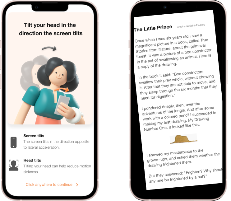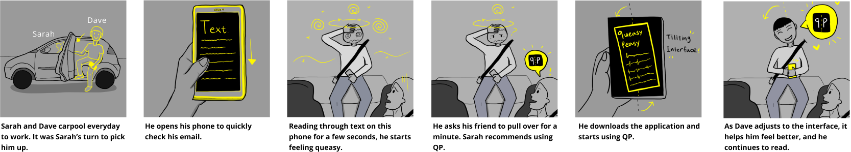 Motion sickness in vehicles is elevated when passengers perform visual tasks like reading, messaging, and navigating. While the increase in the number of autonomous vehicles liberates people from driving, today’s busy lifestyles create a need for passengers to perform these tasks during their commute. QP is a tilting software interface that helps reduce passengers’ motion sickness while they perform tasks on their digital devices. The concept of tilting the user’s head in sync with the car’s lateral acceleration has proven to be effective in reducing motion sickness.