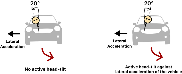 Active head-tilt against the lateral acceleration of the vehicle, just like the driver does while driving, significantly reduces motion sickness in passengers too.[3]