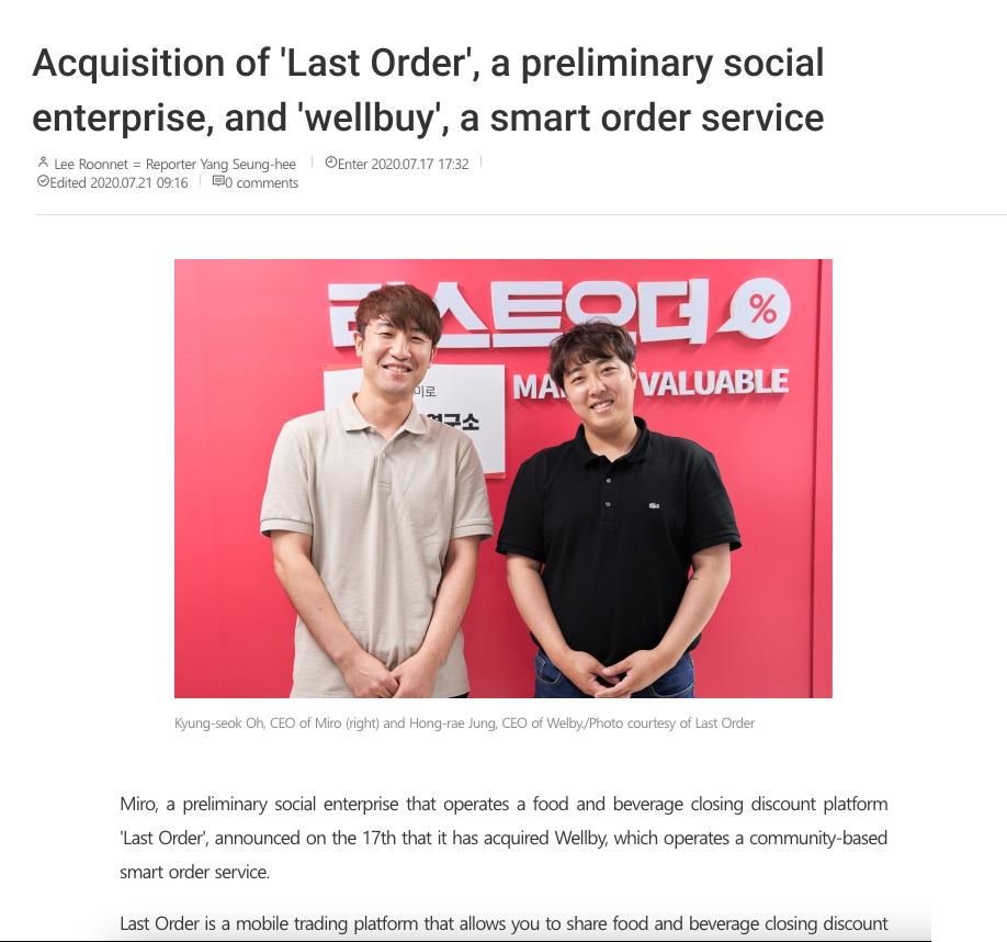 Recently the startup Wellbuy was acquired by Last Order Company, a preliminary social enterprise.