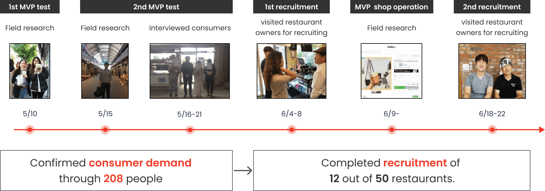 We performed twice minimum viable product (MVP) testing with 208 potential users to prove our new service concept and check consumer demand. We evaluated the order-discounted unsold food and pick-up features with restaurant owners and target user groups.